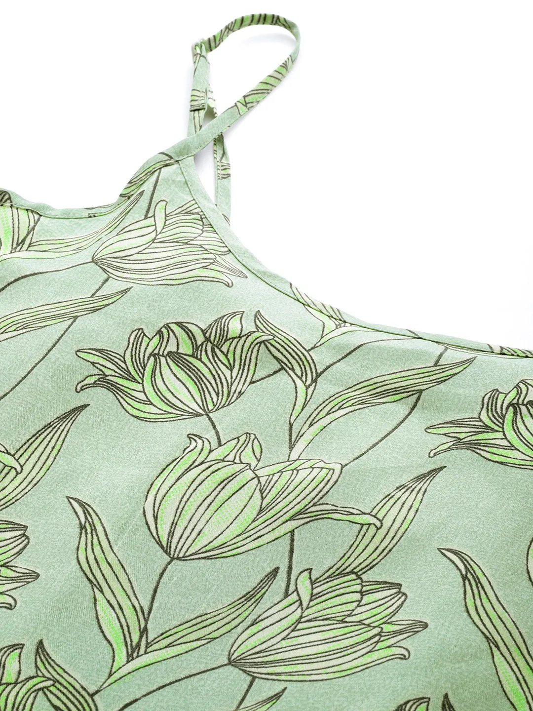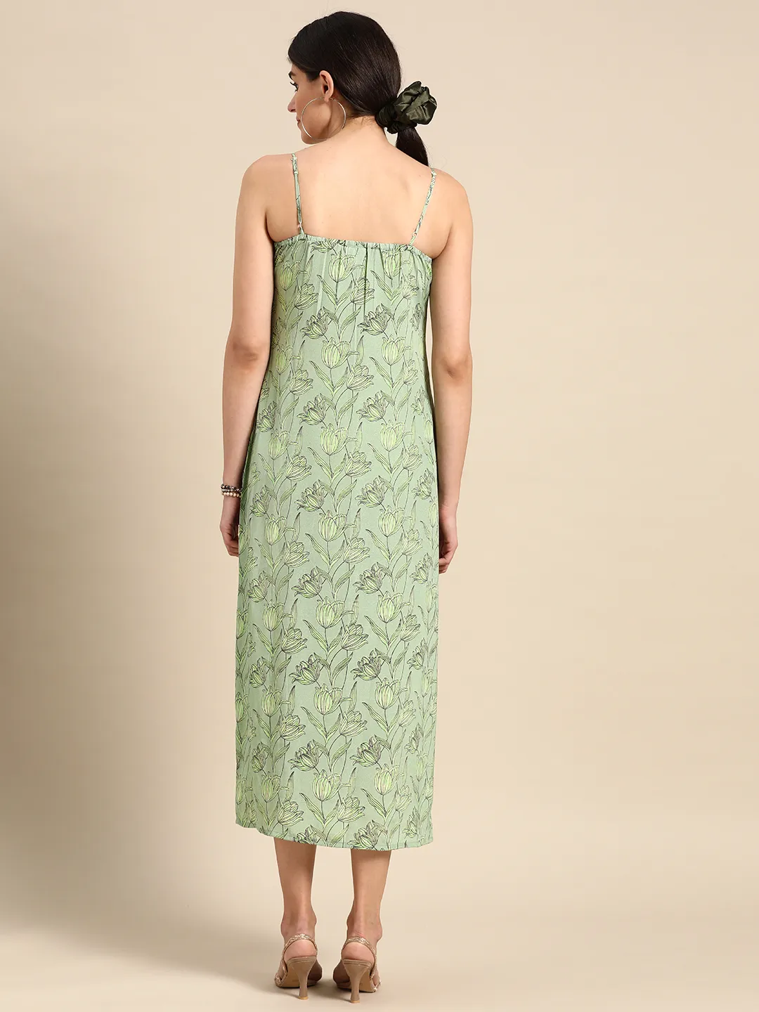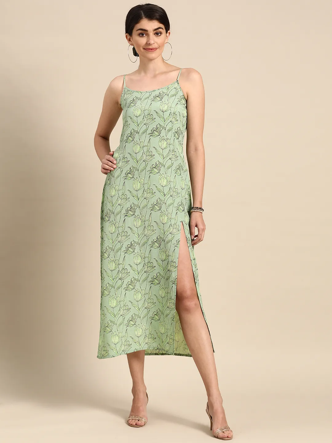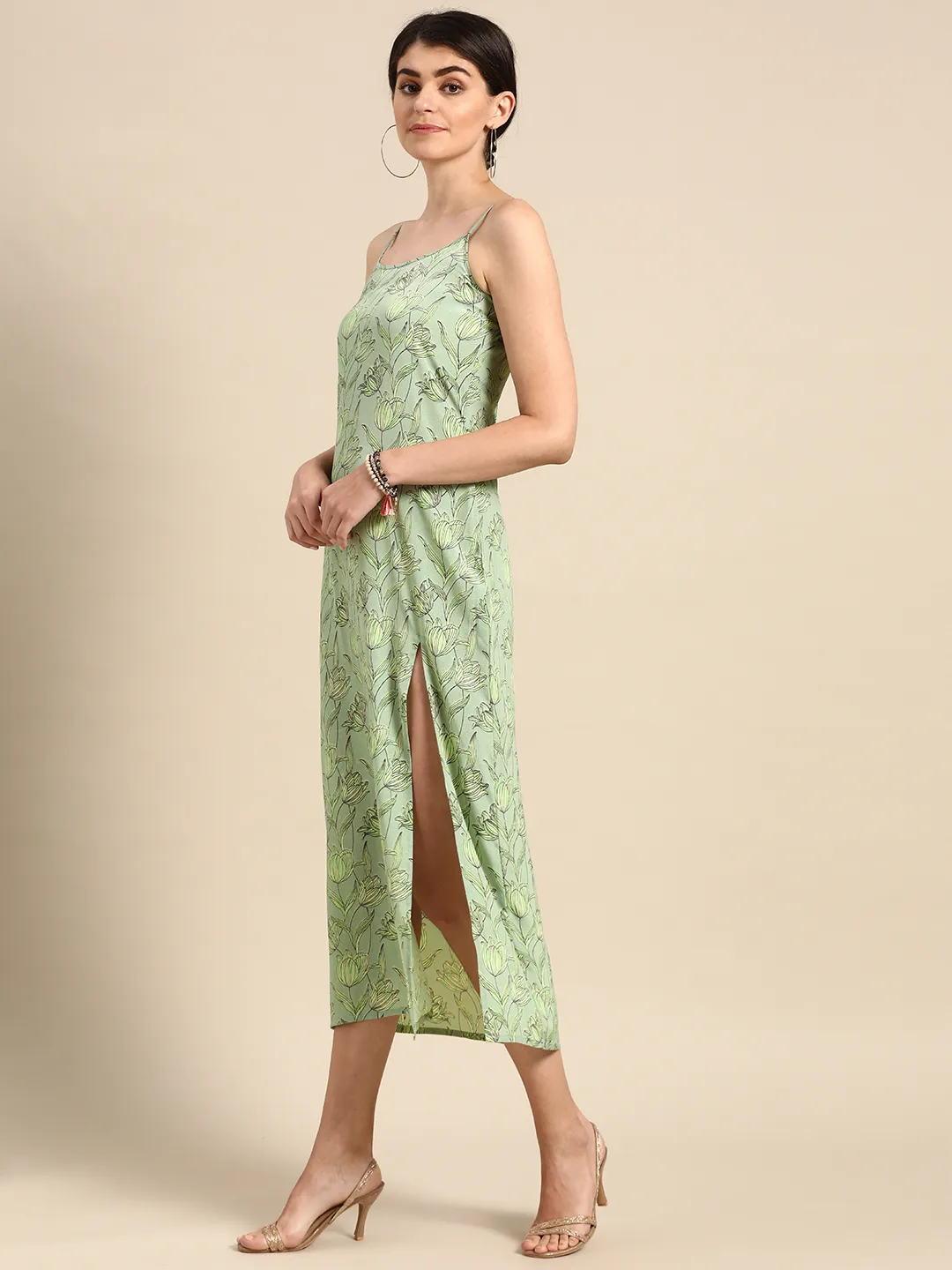 Green printed woven maxi dress, has shoulder straps, flared hem and front high slit