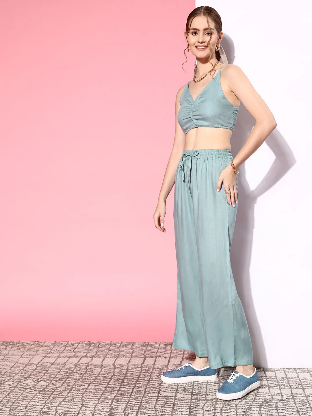 Channel a winning style by wearing this blue crop top and pant set with overlay from Prakrti. Tailored to sartorial perfection from premium quality fabric, it assures a soft