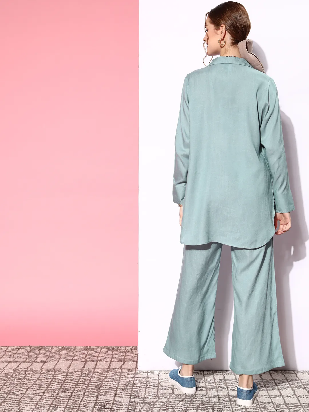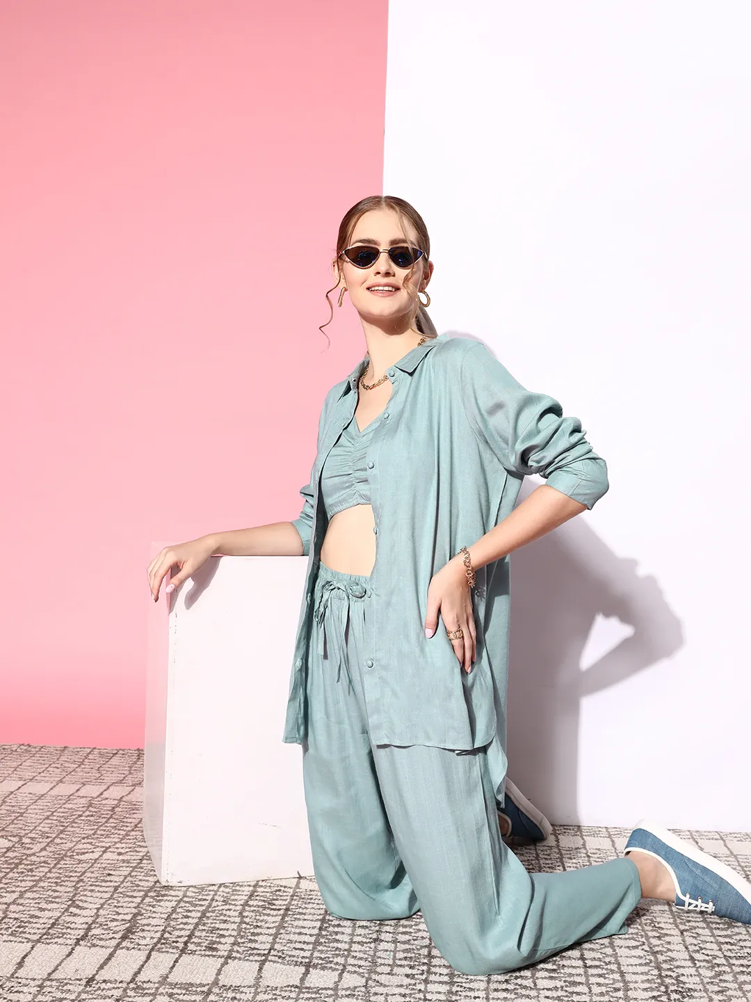 Channel a winning style by wearing this blue crop top and pant set with overlay from Prakrti. Tailored to sartorial perfection from premium quality fabric, it assures a soft and soothing touch against the skin. The shirt collar adds to its appeal. Exuding full sleeves, it is sure to fetch you compliments from all.